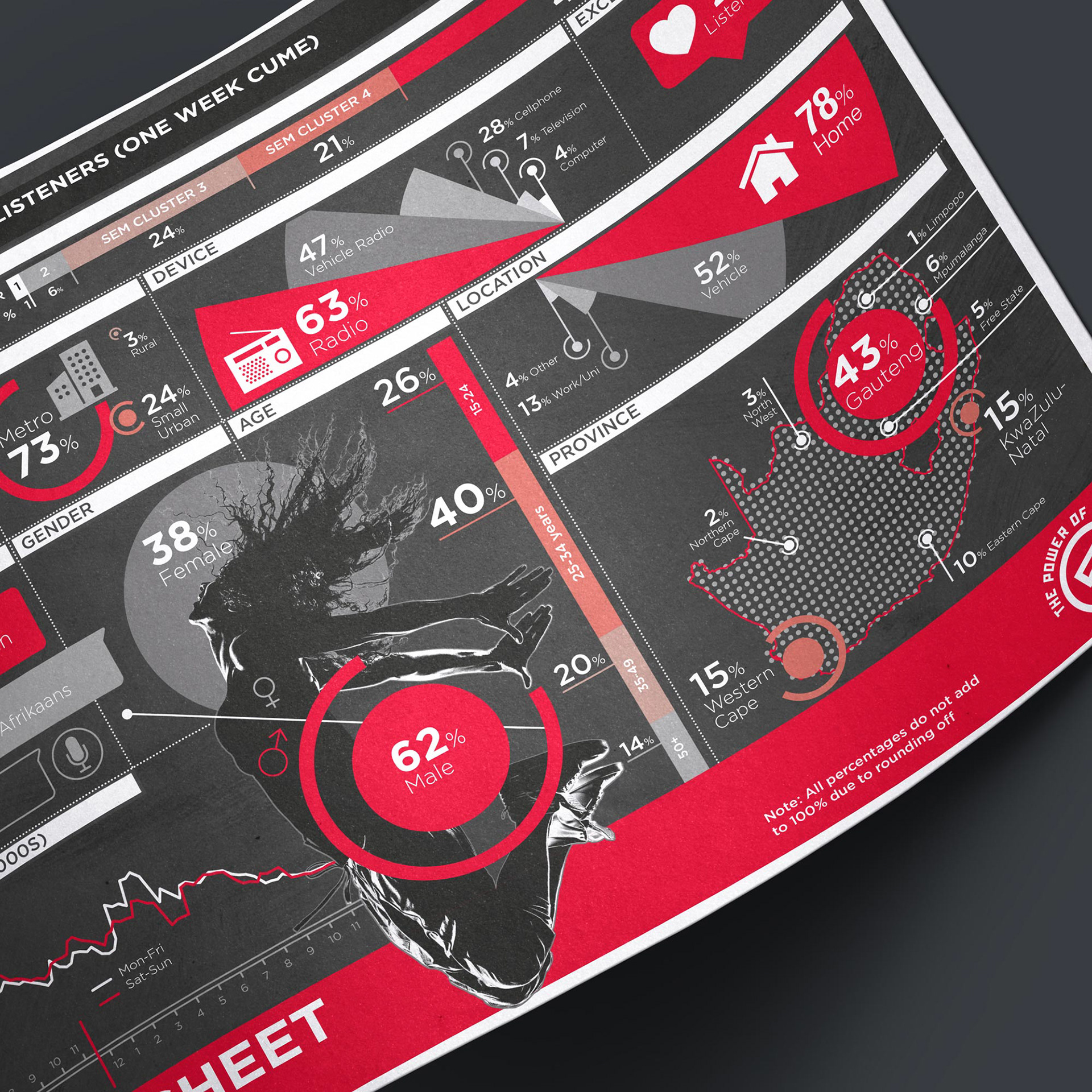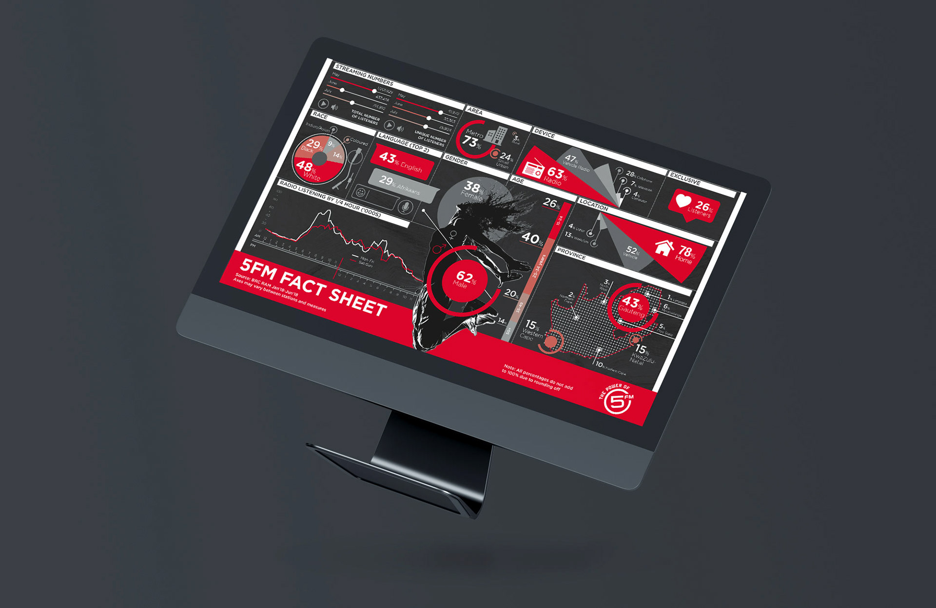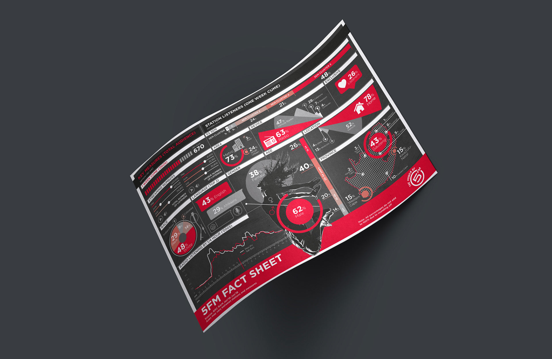An infographic created for SABC (South African Broadcast Corporation) Radio Station 5FM, to visually represent their RAMS (Radio Audience Measurement Survey) data.
