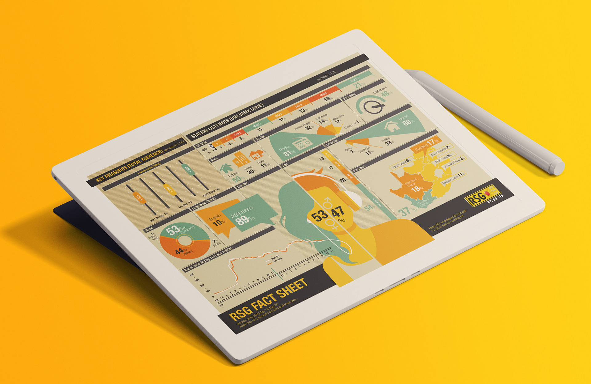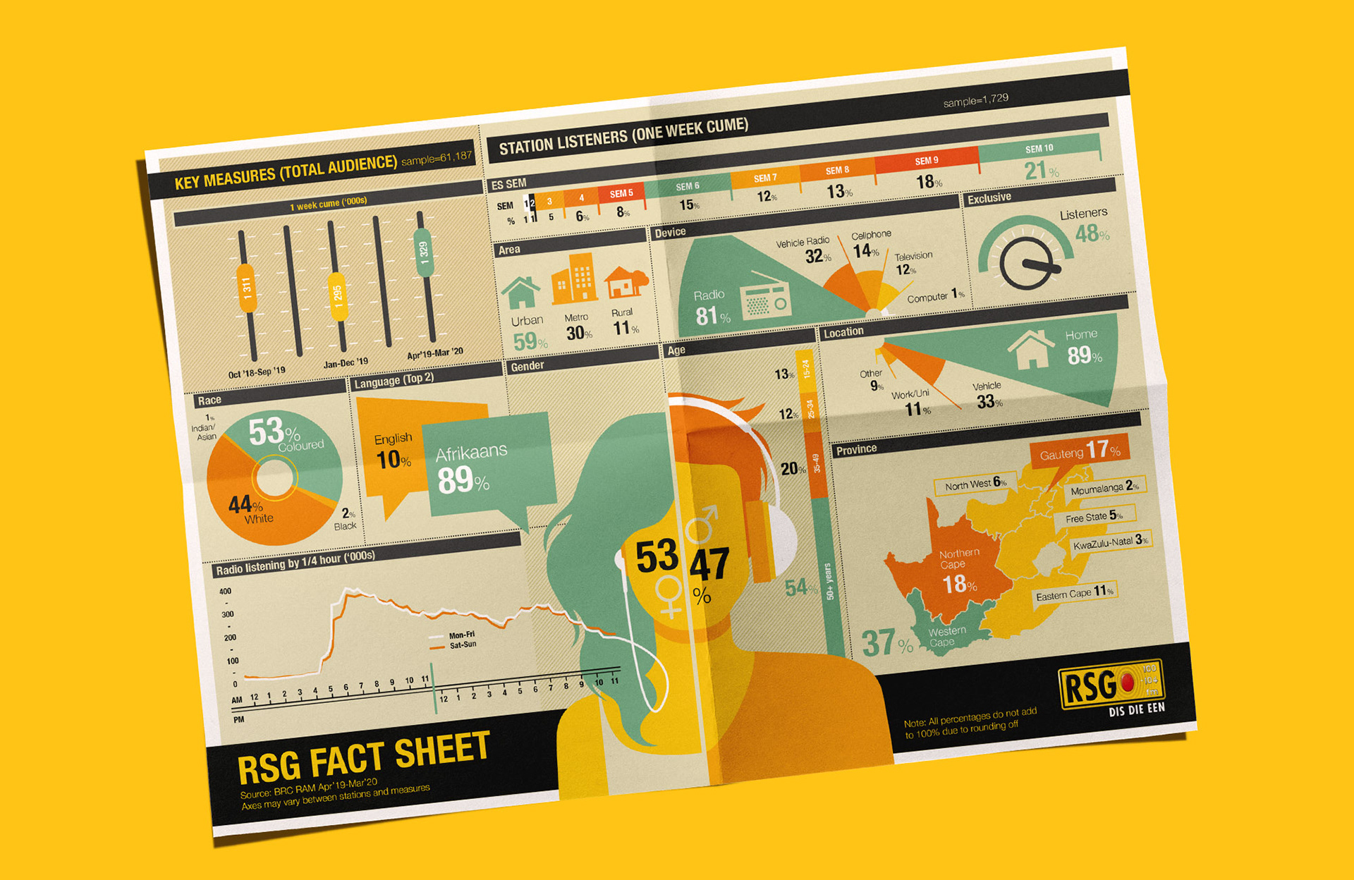 An infographic created for SABC (South African Broadcast Corporation) Radio Station RSG, to visually represent their RAMS (Radio Audience Measurement Survey) data.